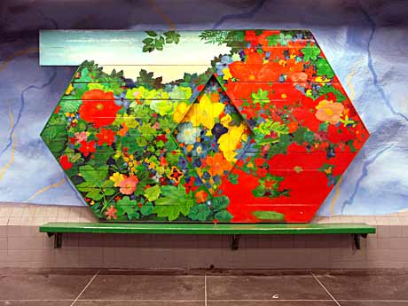 Bench / Sittbänk, T-banestation Stadion, 1973, hartsoljefärg på trä © EnnoHallek
