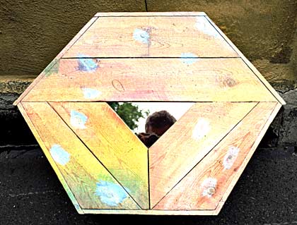 Coffin-side with mirror and pale blue spots / Likkistgavel med spegel och ljusblå fläckar 1976, 57 x 75 x 25 cm © Enno Hallek